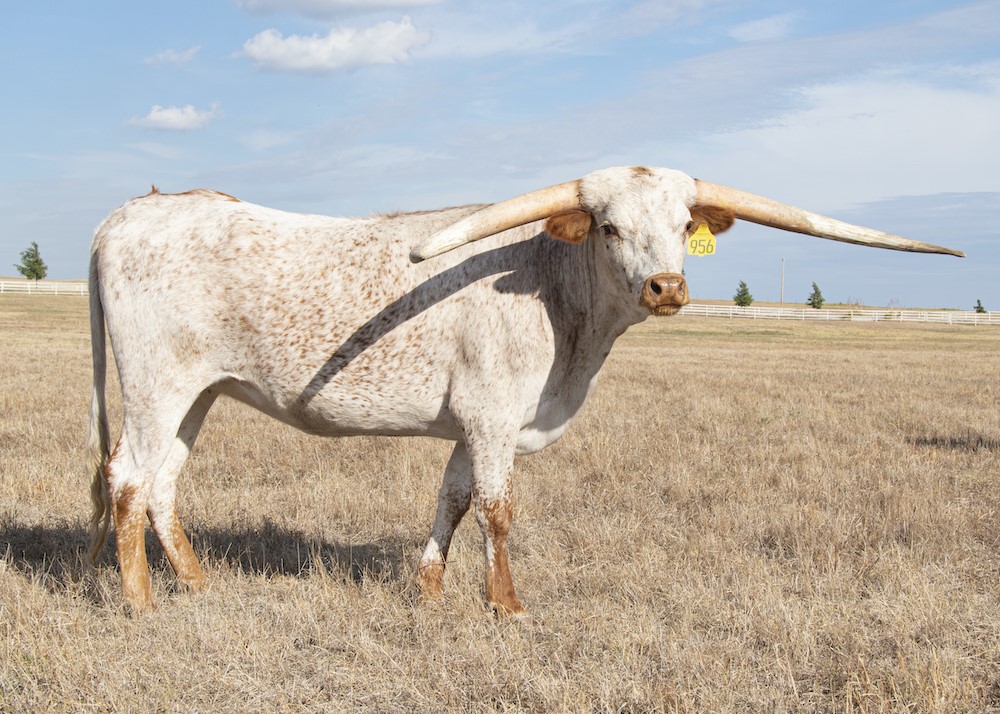 Lot 45- Check out the super cool swoop horns on the red roan daughter of TCC Gunsmoke and RJF Imagine - who is a product of two breed leaders: Cowboy Tuff Chex and M Arrow Cha Ching. 90" sire, breed leading genetics, wow factor written all over her. Take home a package feature the top of the breed right here. 60.5" Exposed to TCC Gunsmoke.