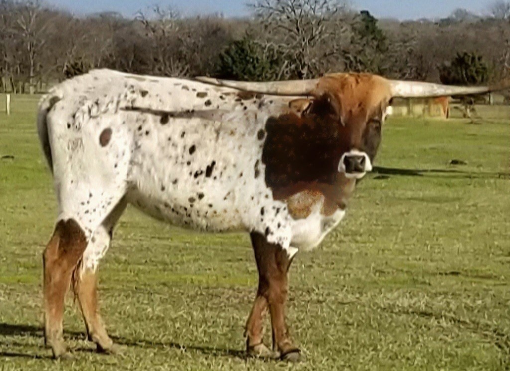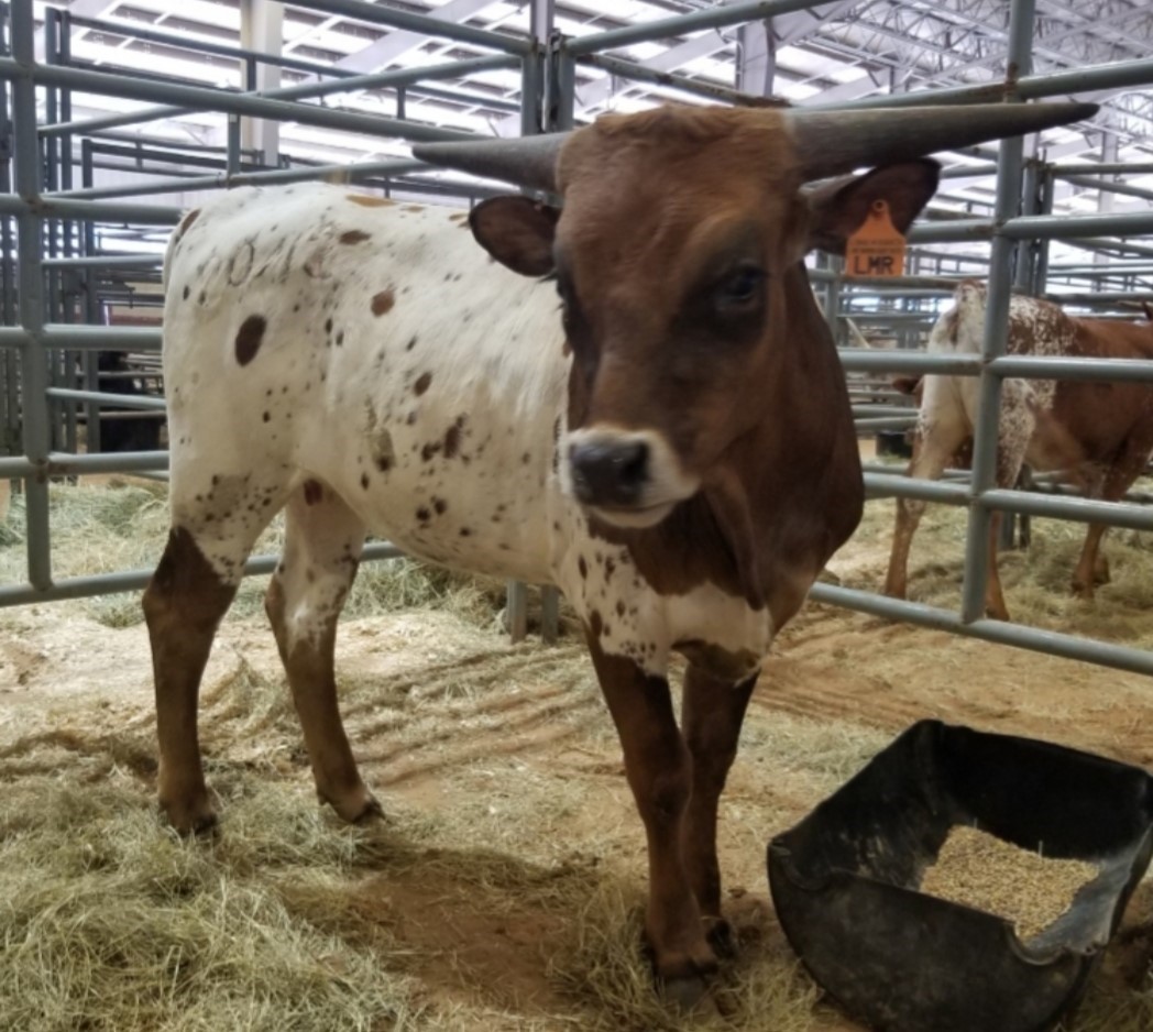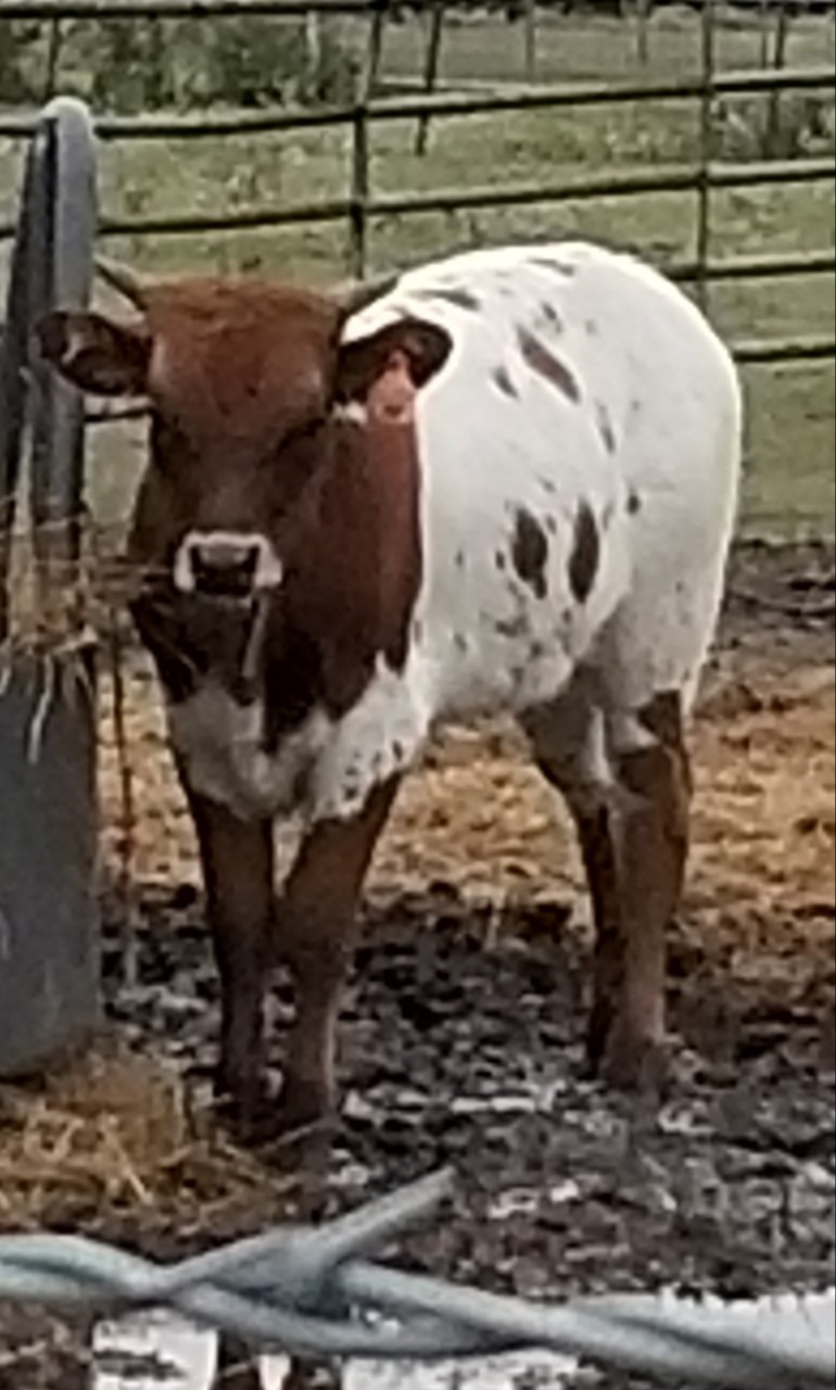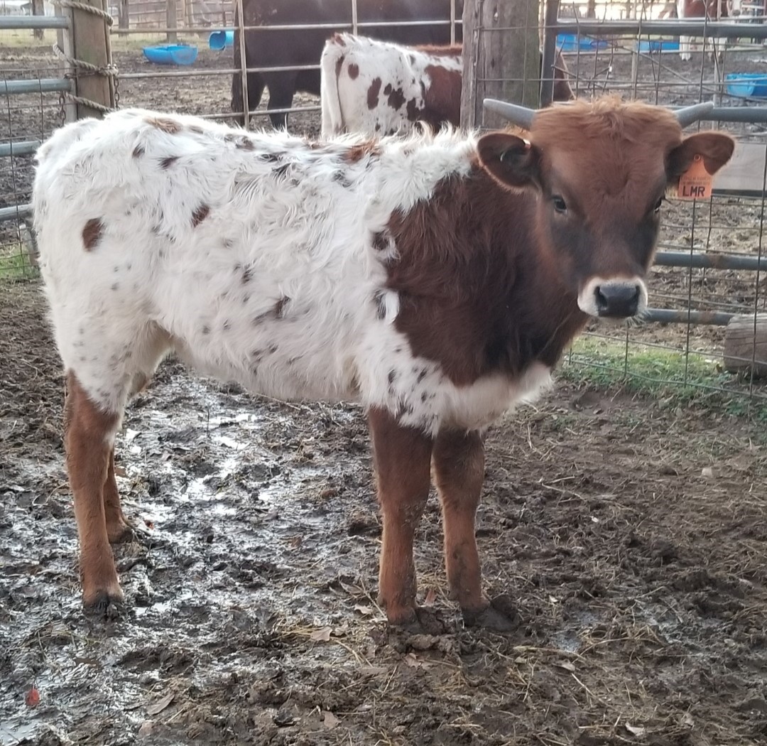 LMR SMOKIN BABY RUTH is a brown and white heifer. She is well balanced and sweet natured. Her Sire is TCC GUNSMOKE, who is a son of 703 RHF SHARP SHOOTER, going back to TOP CALIBER and HCR. On the bottom his Dam is HERSHEYS KISS, going back to HUNTS DEMANDS RESPECT, that goes back to HCR. RUTH'S Dam is KC HERSHEYS KISS. KISS'S Sire is HUNTS DEMANDS RESPECT, going back to HCR. Her Dam is KC HERSHEY, going back to JR GRAND SLAM, THE SHADOW and GUN MAN! This heifer has a double shot of HUNTS DEMANDS RESPECT, who died at a very young age. A triple shot of HCR and a double shot of Gun Man, The Shadow, JR Grand SLAM and many more greats! Hershey is 90.25 inches TTT and 121.75 inches TH! That puts her 5th in the world of TH! Her Sire Gunsmoke has over 84 inches TTT as of 2019! We expect great things from this heifer! She has black horns, and will probably grow slow, to begin with.